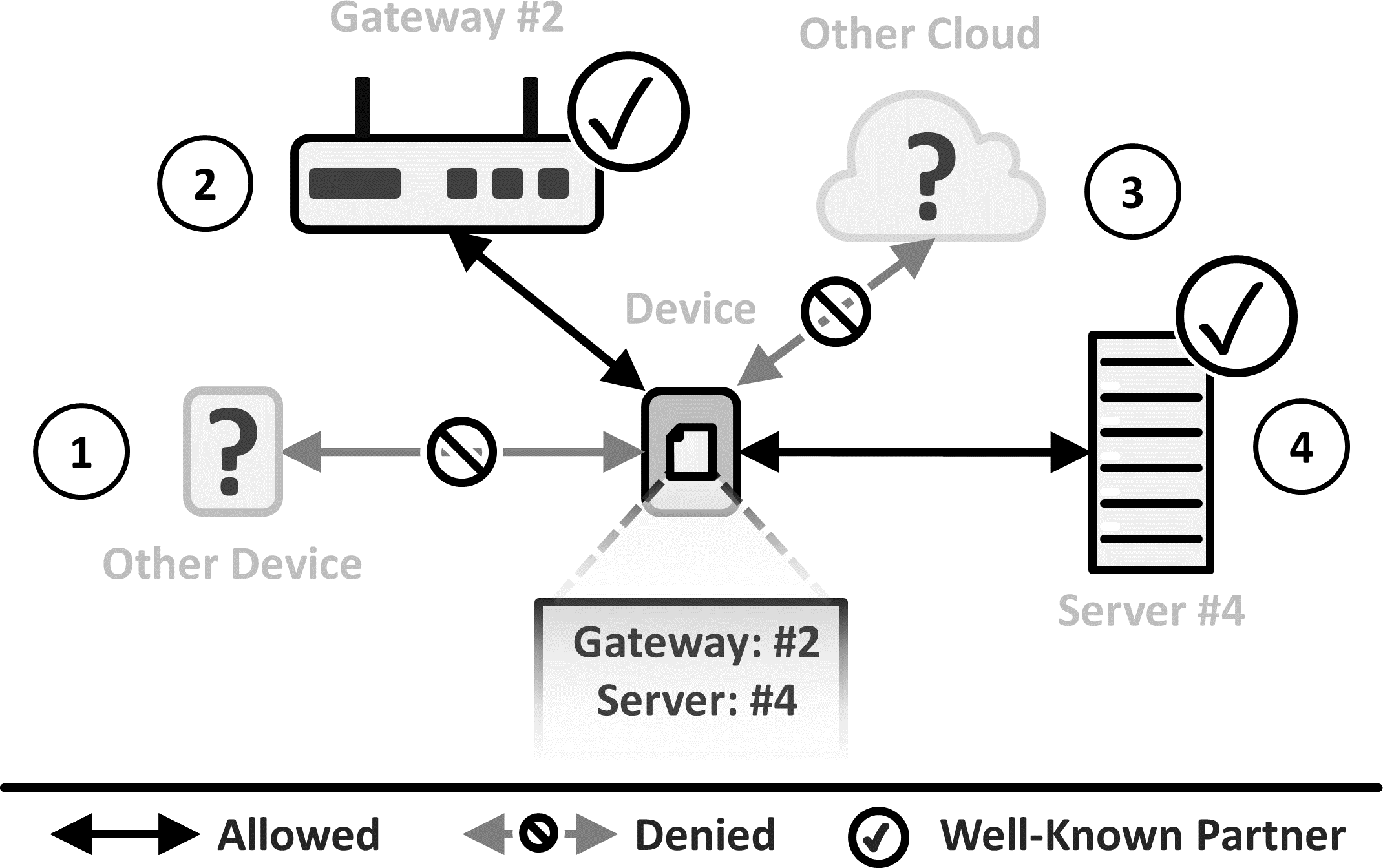 IoT environments may contain all sorts of devices and other components that are not under your direct control. These may pose a security or privacy risk to your devices and data. Limit your devices’ autonomy and configure them to communicate only with trusted partners. Block and notify connection attempts from other sources.